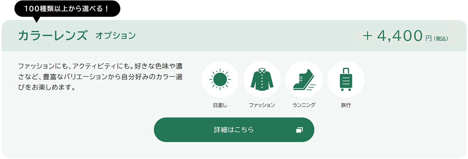 眼鏡市場では、全てのフレームに追加料金なしで高品質な「標準クリアレンズ」が付属します。さらに、さまざまな機能を備えたオプションレンズ(税込4,400円〜)もご用意しております。お客様のライフスタイルや用途に合わせて、レンズをカスタマイズできます。