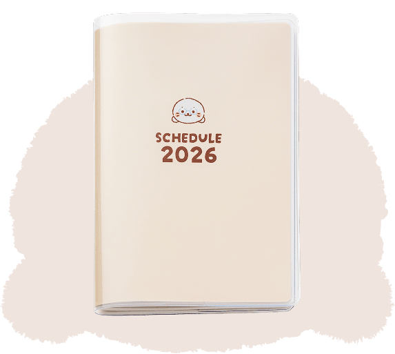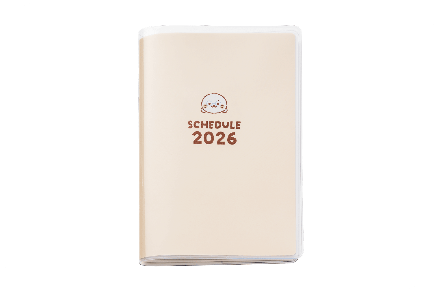 クリエイティブヨーコのキャラクター、真っ白でふわふわなたてごとアザラシの『しろたん』と、眼鏡市場のコラボスケジュール帳です。