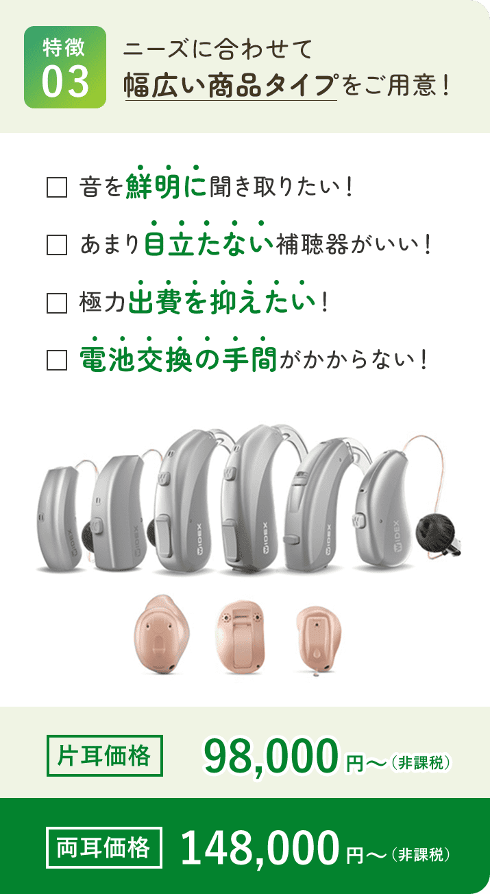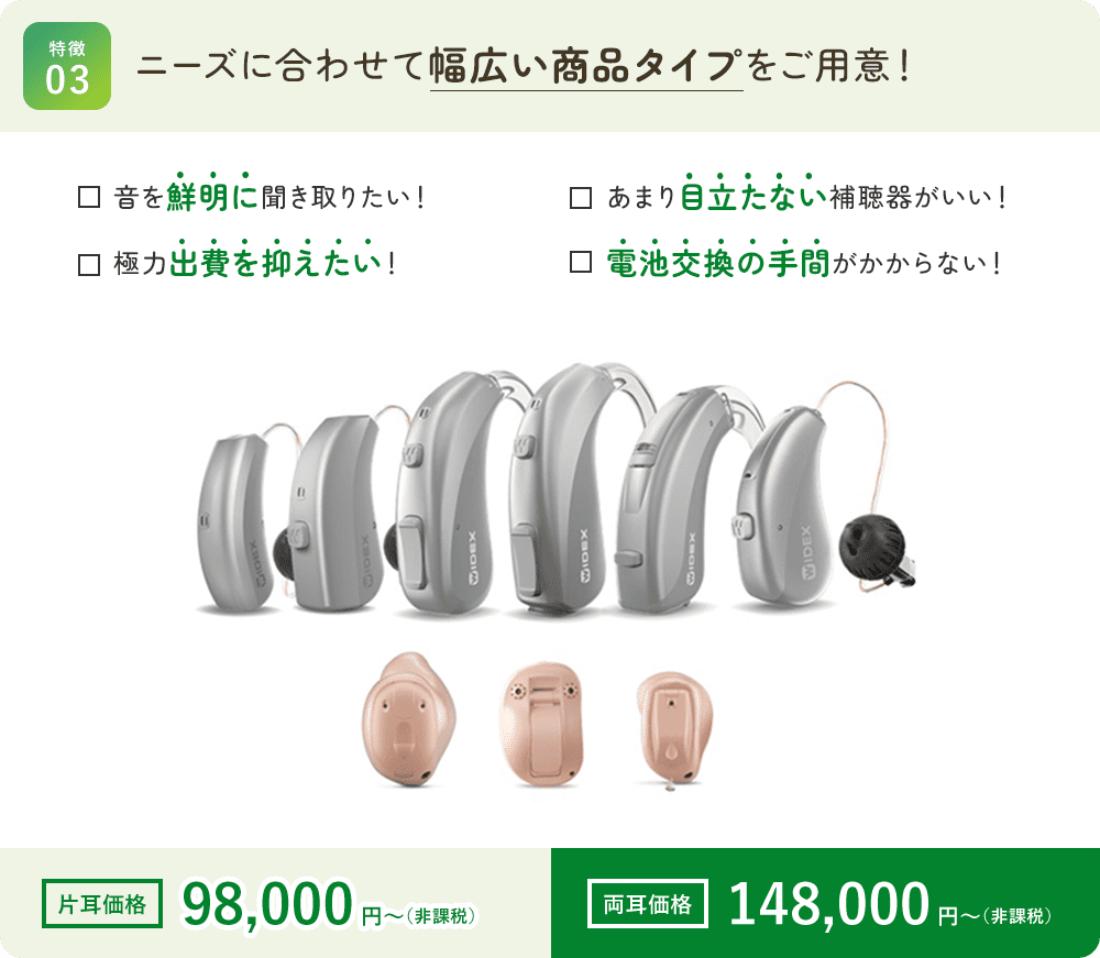 補聴器はメーカーによって音色の特徴が異なります。幅広いメーカーを取り扱う眼鏡市場ならお客様の音色の好みにあった補聴器をお選びいただけます。