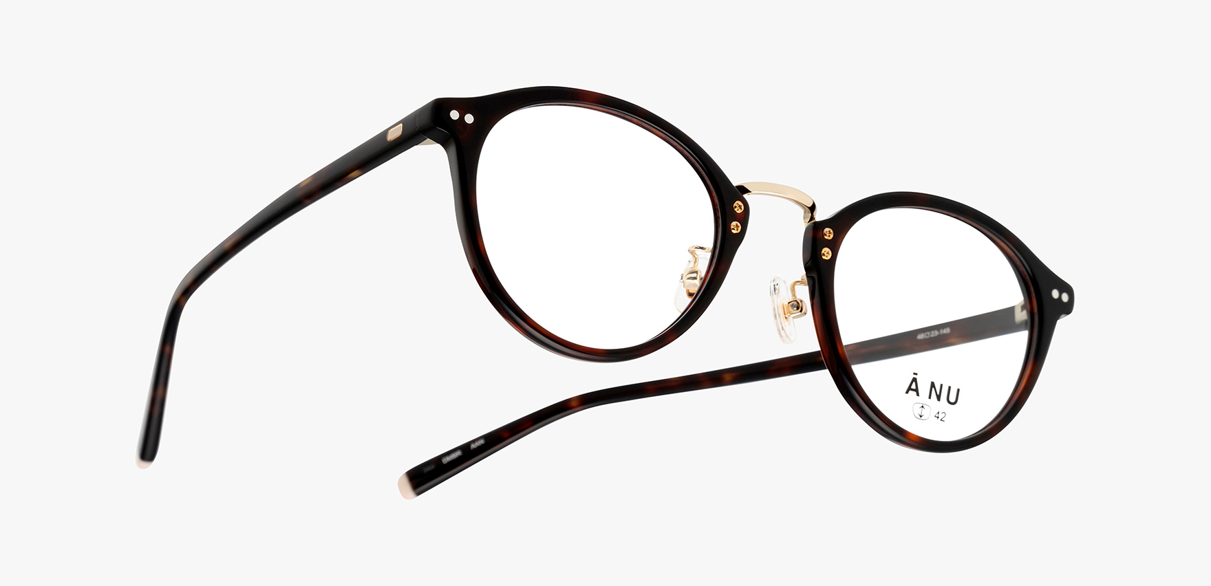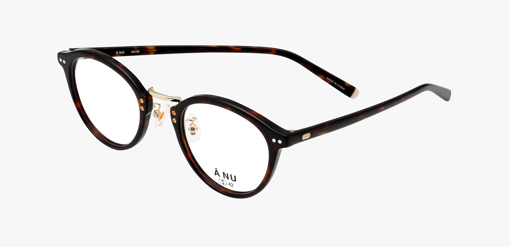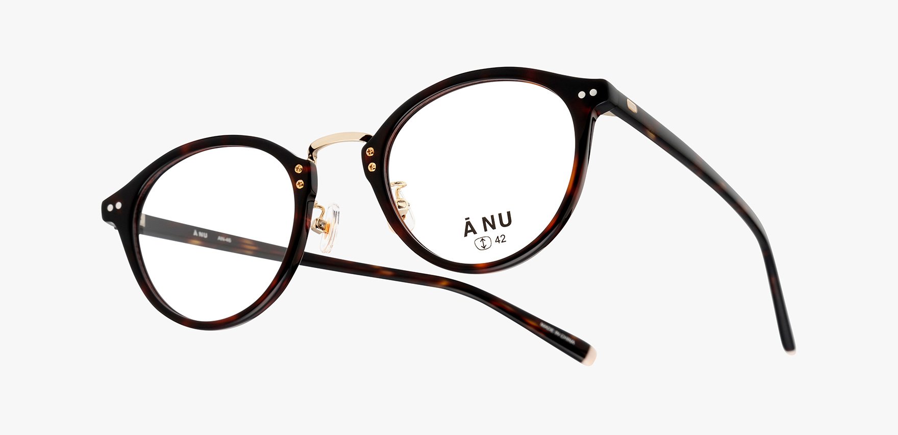 シルエットの変化や旬の色味を取り入れて軽やかに“今”を漂わせる、そんなニュアンスを大切にするアイウエア「A NU」。AN-46はクラシカルなボストンシェイプです。レンズをつなぐブリッジ部分にメタルを採用したコンビネーションデザインで、ボリュームのあるフロントデザインをすっきりと見せてくれます。ツルの先端にカラーを施し、ワンポイントアクセントになっています。