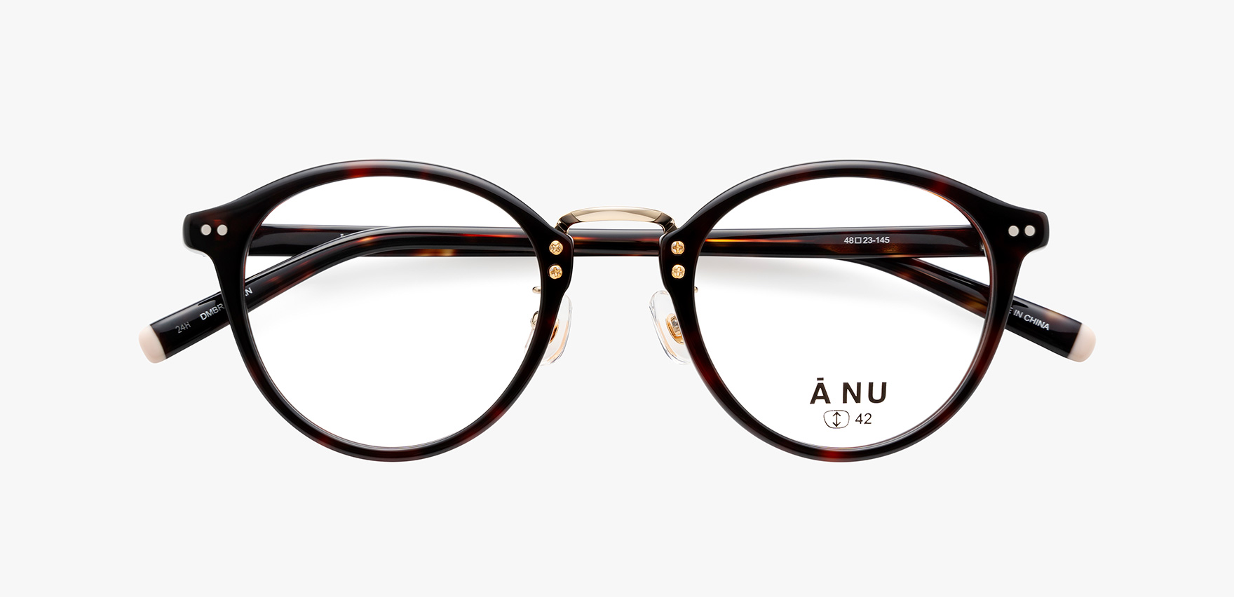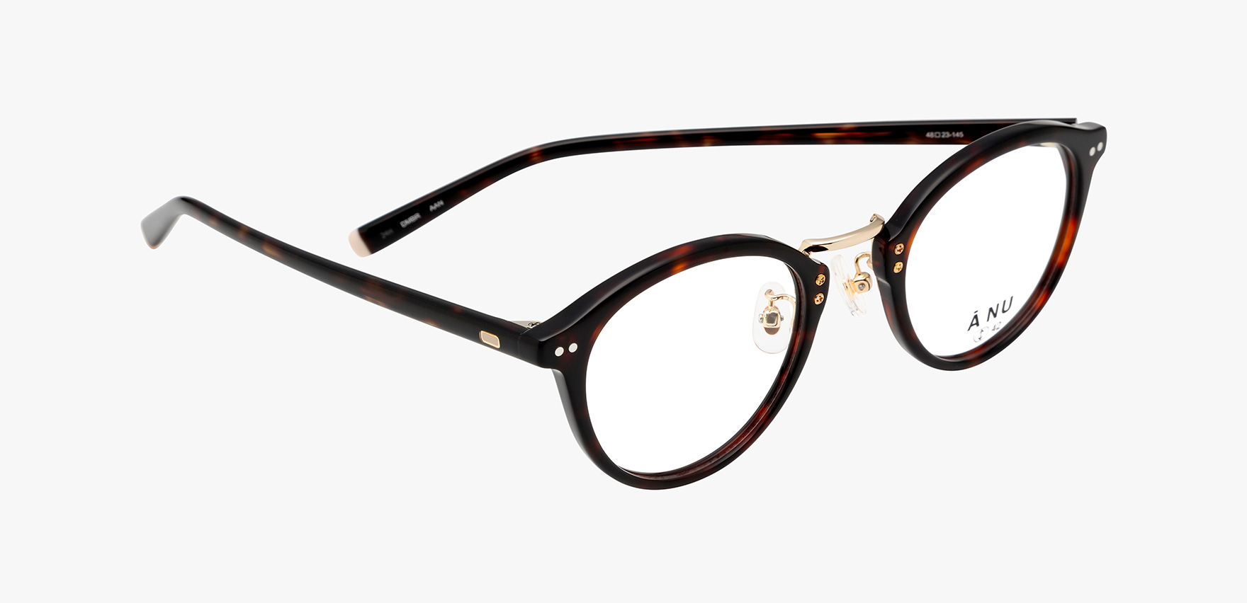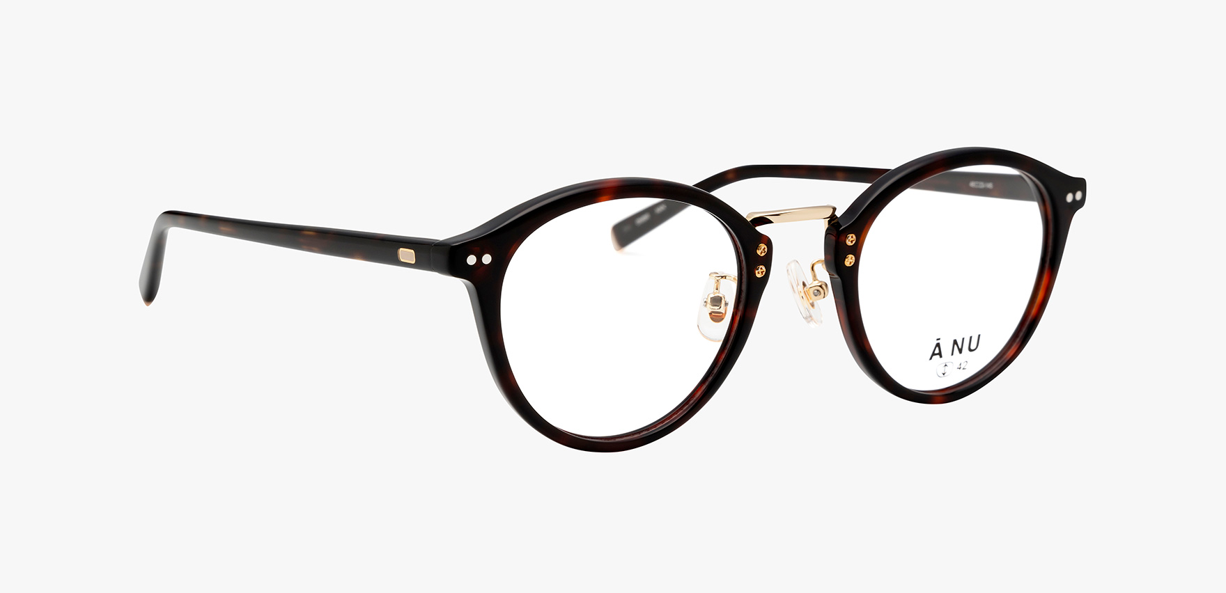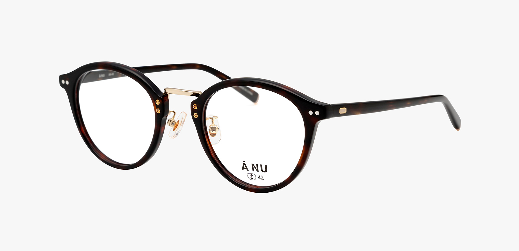 シルエットの変化や旬の色味を取り入れて軽やかに“今”を漂わせる、そんなニュアンスを大切にするアイウエア「A NU」。AN-46はクラシカルなボストンシェイプです。レンズをつなぐブリッジ部分にメタルを採用したコンビネーションデザインで、ボリュームのあるフロントデザインをすっきりと見せてくれます。ツルの先端にカラーを施し、ワンポイントアクセントになっています。
