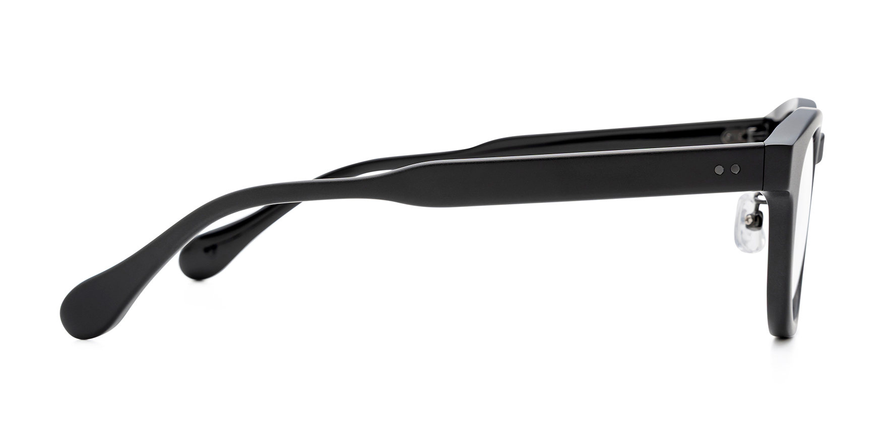 AN-52Bは、太めのアセテートで仕立てたウェリントン。鍵穴のようなキーホールブリッジをやや上に配し、見た目の重さを抑えています。太めのテンプルに強弱をつけ、耳元に向かって細くなる設計で安定感を高めているため、かけ心地も快適です。表面:マット仕上げ、裏面:ツヤ仕上げ、メタル:ツヤ仕上げ