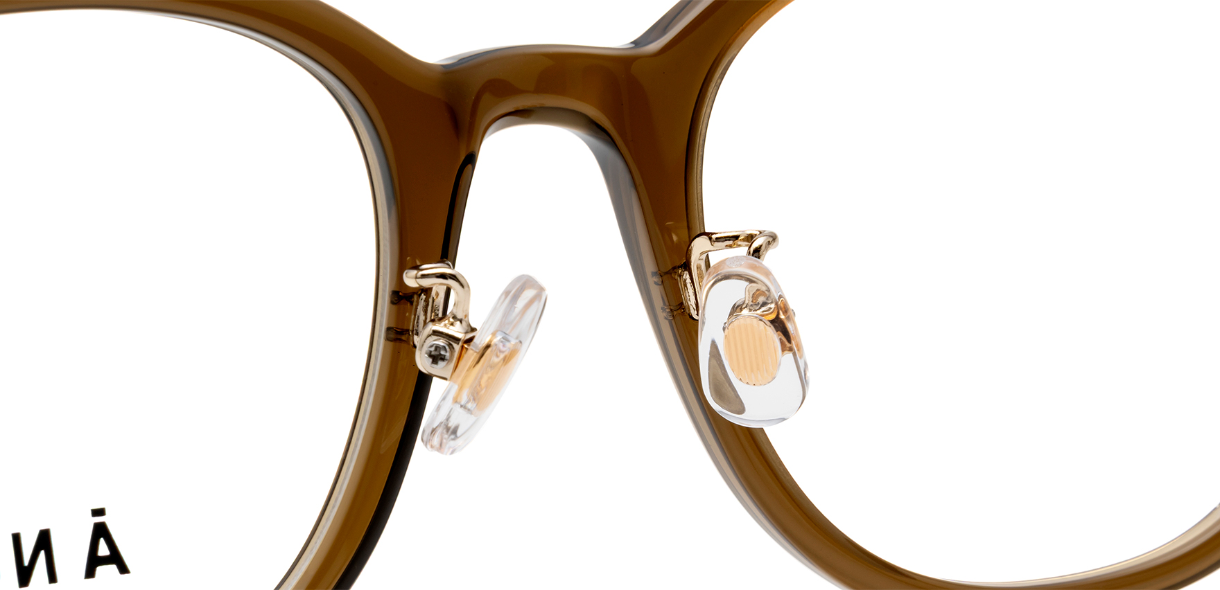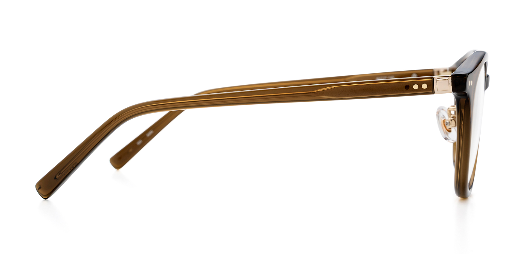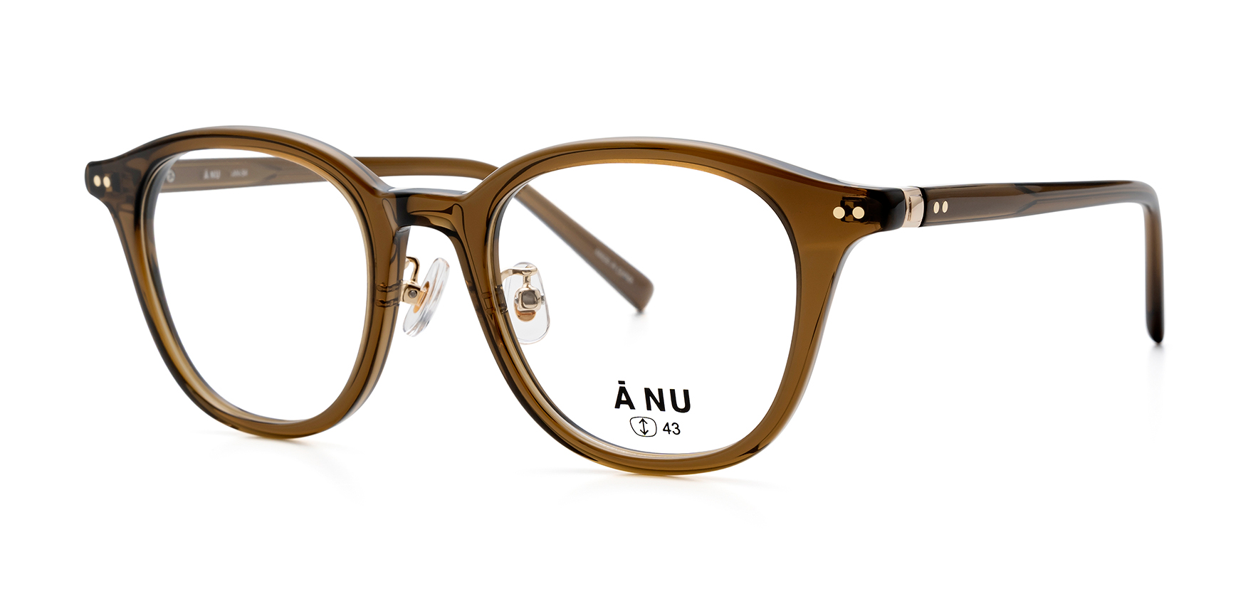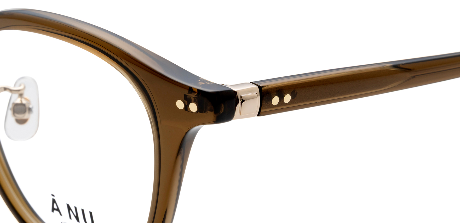 常に変化する旬のシルエットや色味を取り入れて軽やかに”今”を漂わせる、そんなニュアンスを大切にするアイウェア「A NU」。AN-54は、縦に高さを持たせたウェリントンシェイプです。テンプルの合口付近に存在感のあるスクエア型のメタルパーツを配置することで、今っぽさと高級感を演出しています。また、フロントとテンプルにメタルパーツを配置することで、クラシックな印象を与えます。