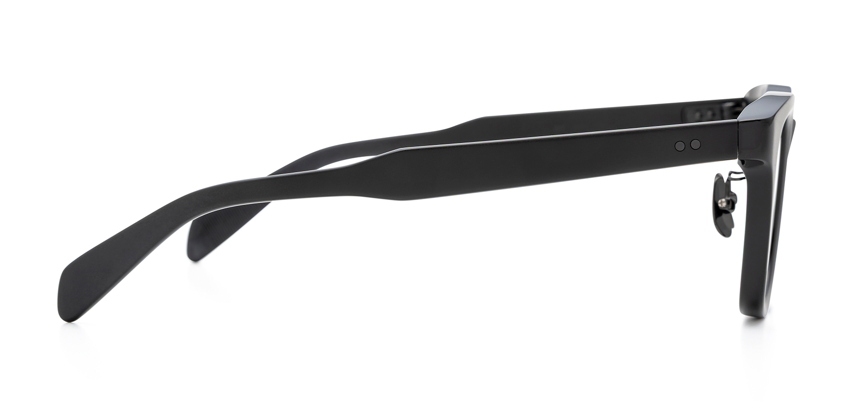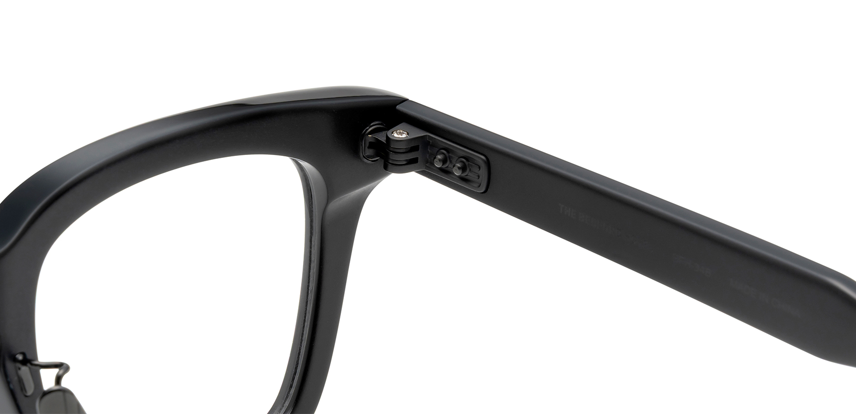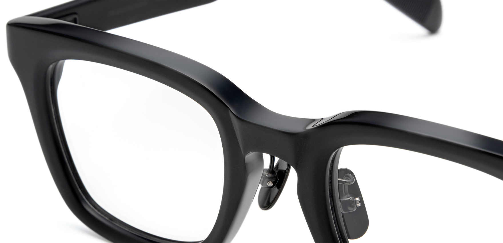 BFH-34Bは、直線的なシルエットが印象的なウェリントン。装飾は最小限に、内側の斜めの面取り(テレビジョンカット)とテンプル先端の滑り止めでクラシック感を添えます。太めのテンプルは耳元に向かって細く、見た目もかけ心地もすっきりとした一本です。正面/裏面:マット仕上げ、コバ(厚み部分):ツヤ仕上げ