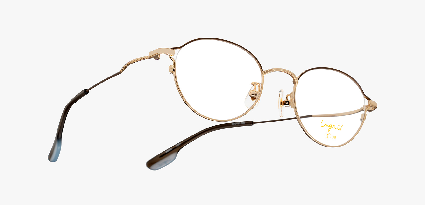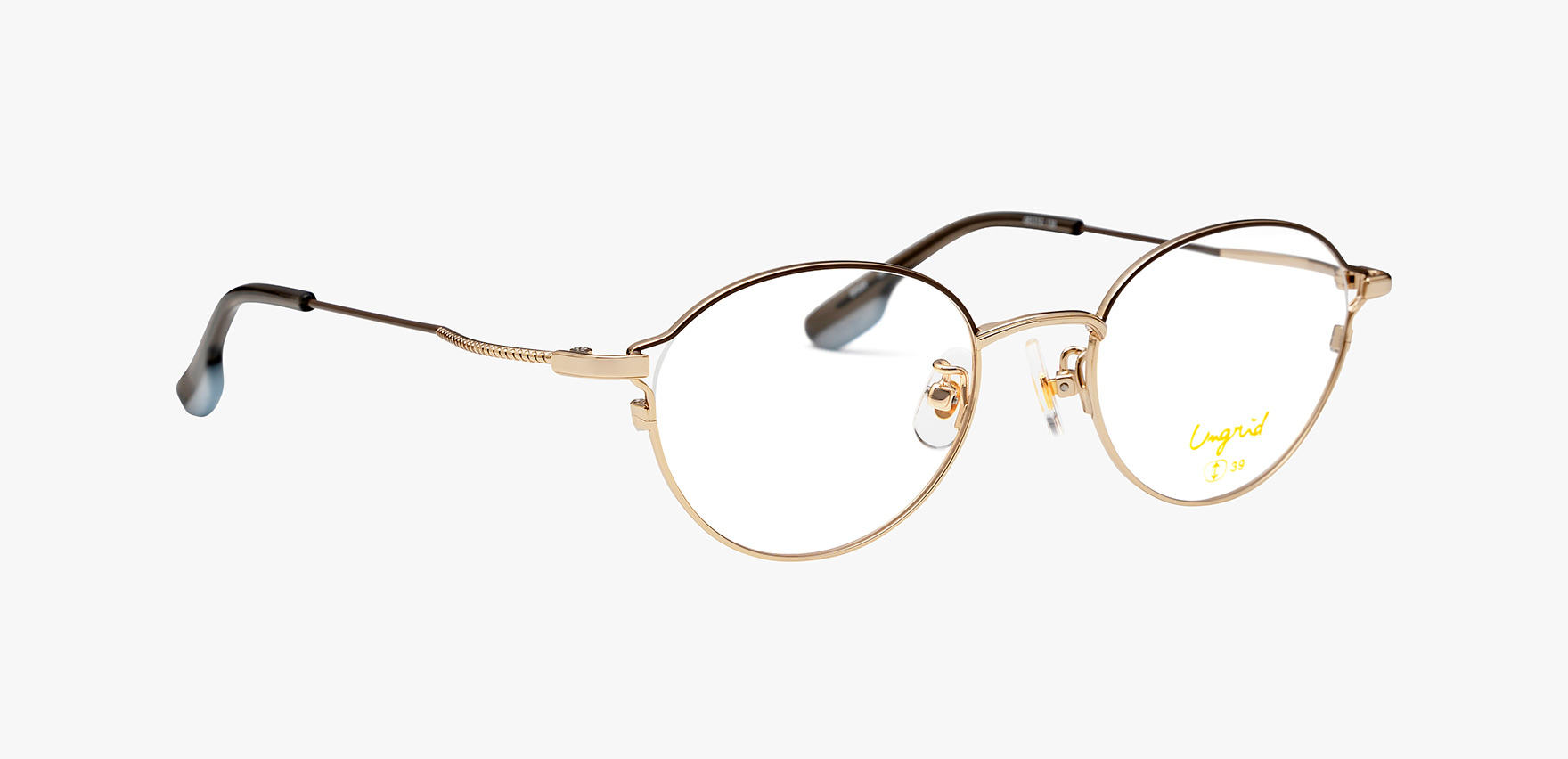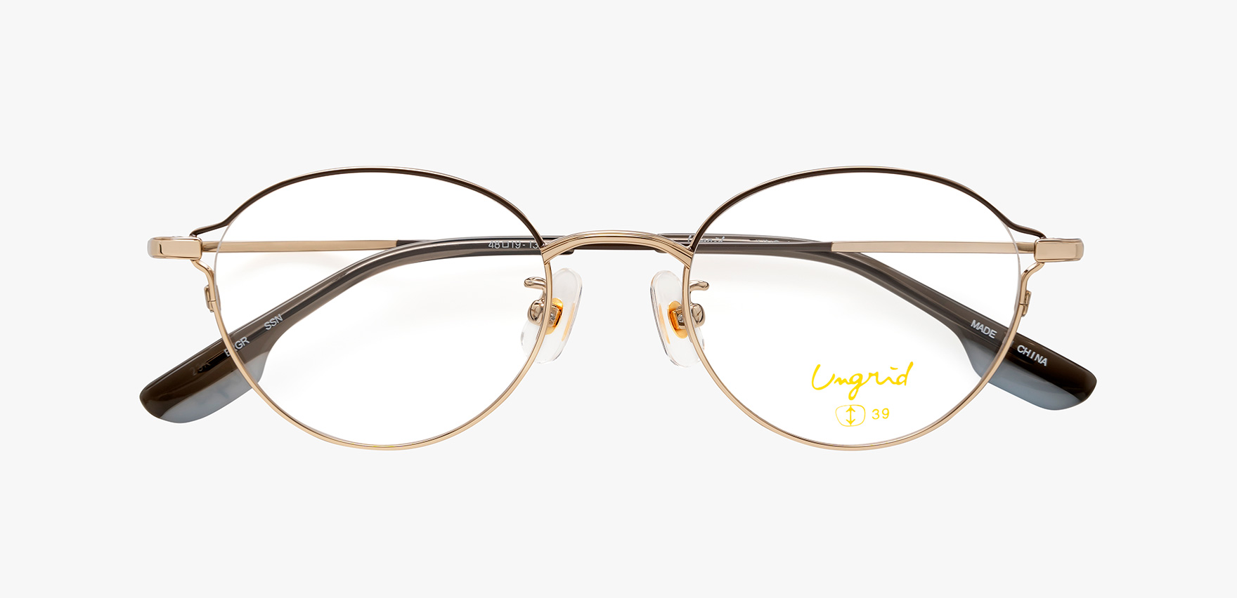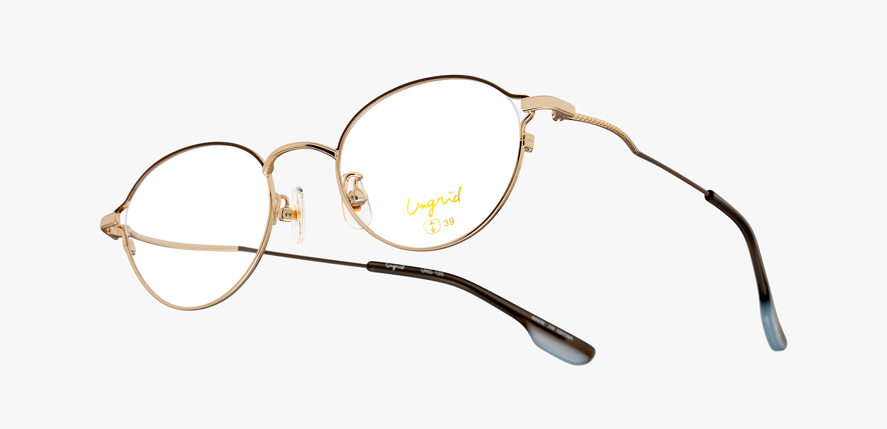 新しいUngridは、モダンの形状に個性を出したり、フロントに張り合わせを入れたりし、ディテールにこだわったデザイン要素を入れ、更に掛ける人の個性を引き出すコレクションとなっております。UNG-126は、フロントヨロイ付近の抜きデザインが程よいアクセントのフレームです。テンプルは立体的な縄模様となっており、掛けても見ても可愛いデザインです。カラーはベーシックなものやアクセントカラーを取り入れ、どれも肌馴染みが良いものを採用しています。