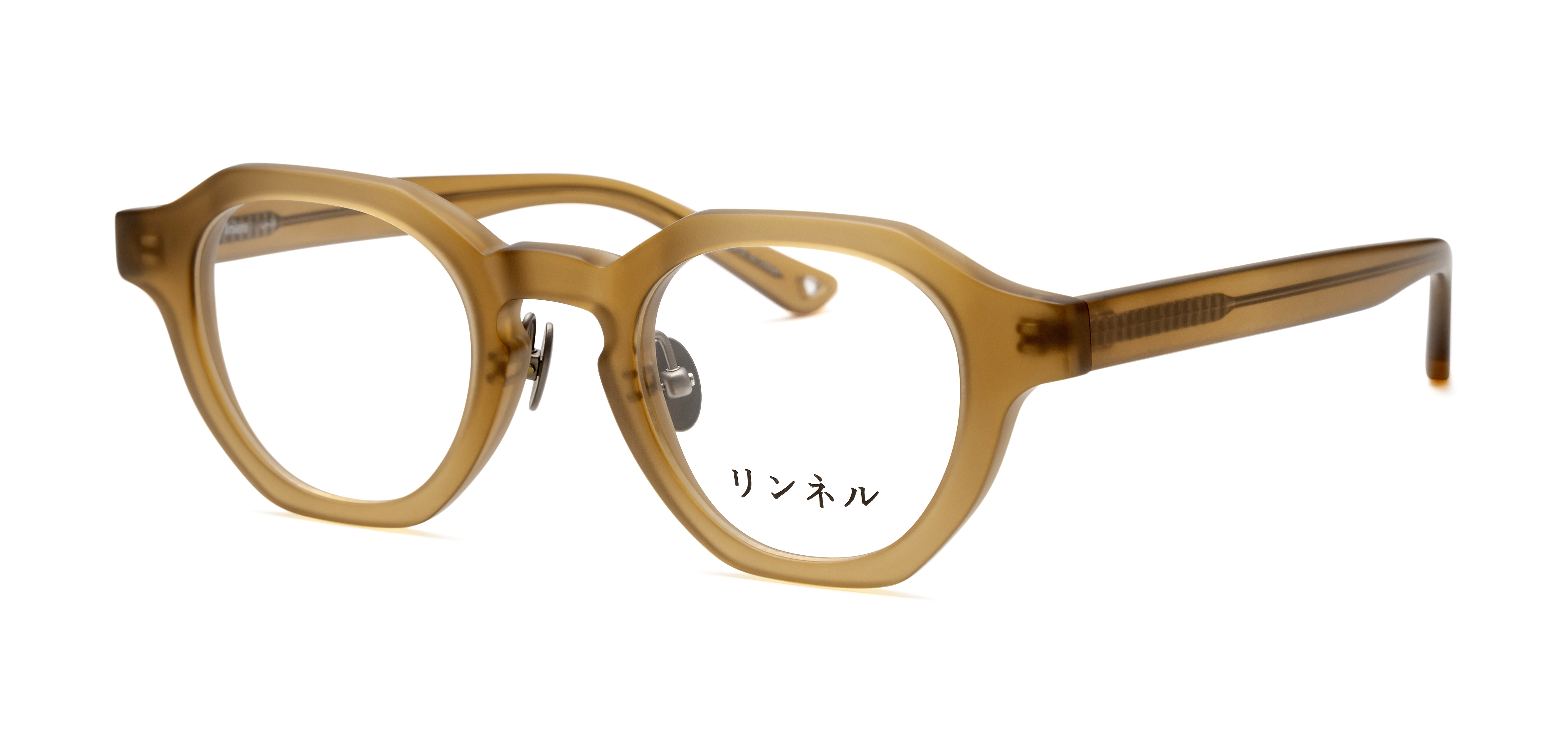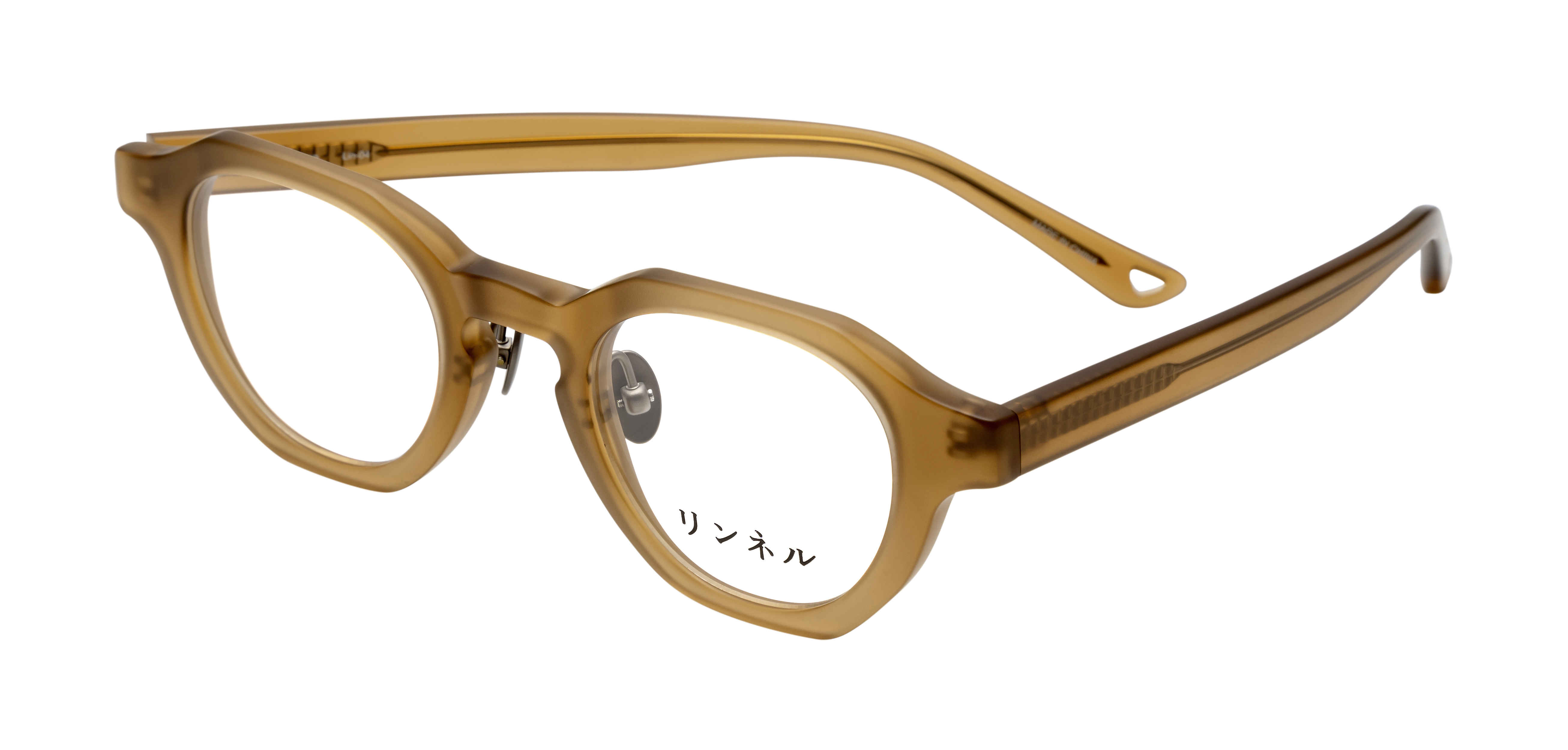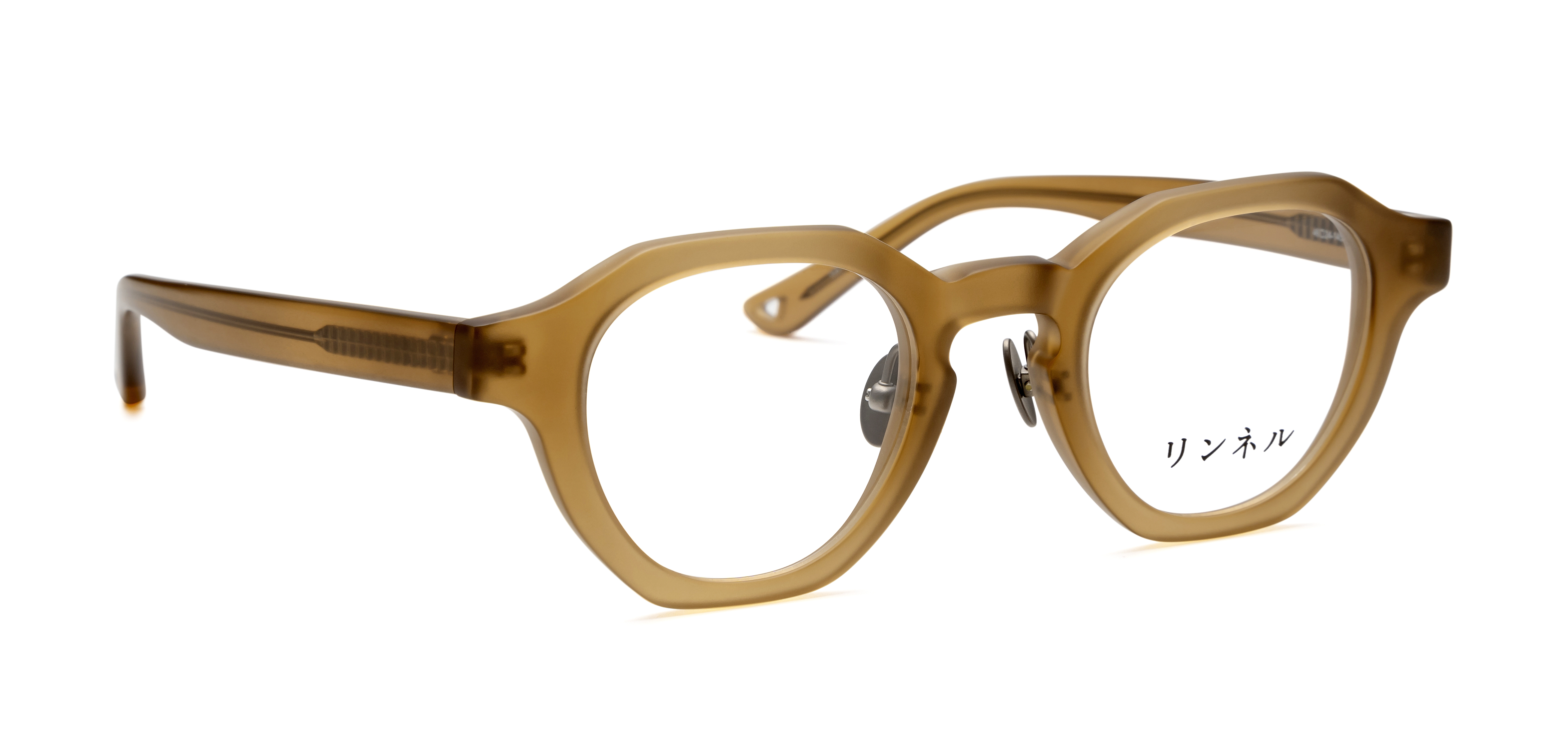 Lin-04は、厚めの生地と存在感のあるレンズシェイプが特徴的です。触り心地の良いハーフマットの質感と角の取れたデザインが、温かみのある雰囲気を演出します。セル先にあいた穴が、置いたときの可愛いポイントです。