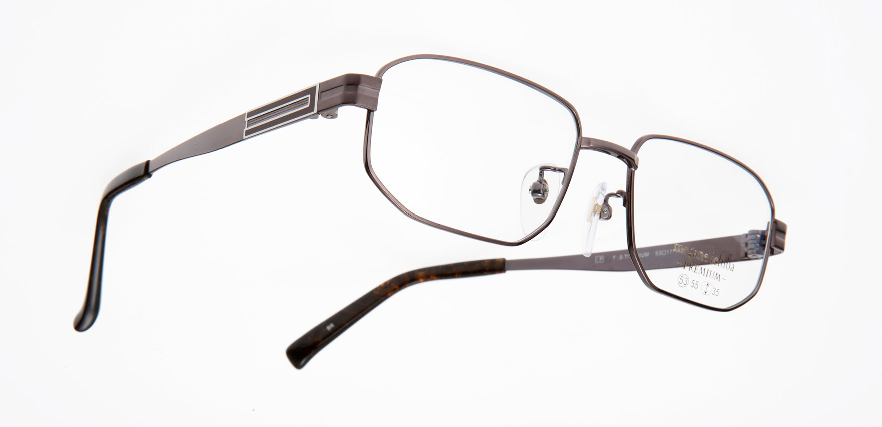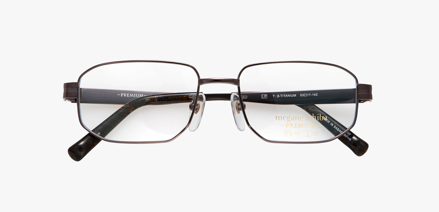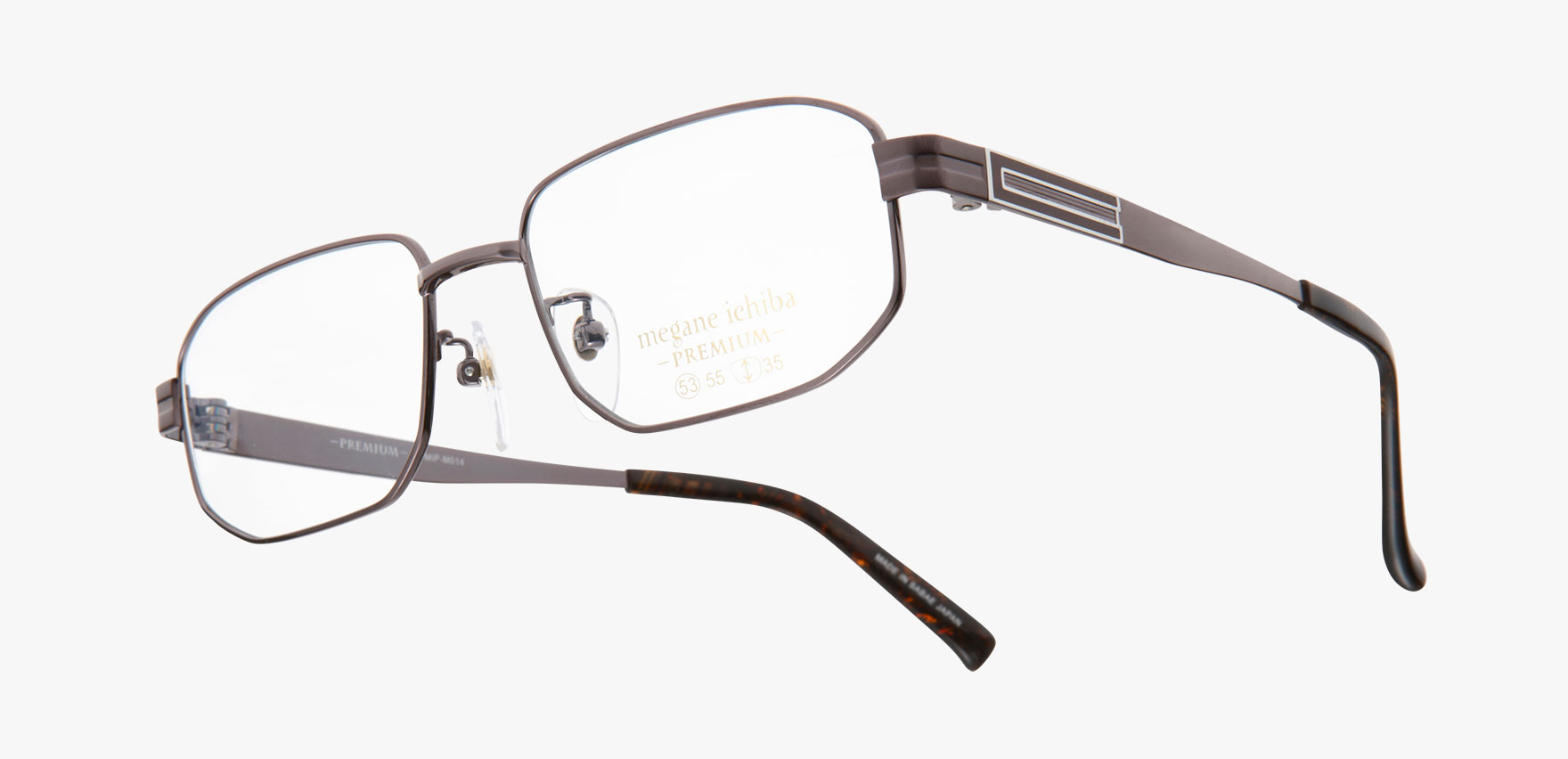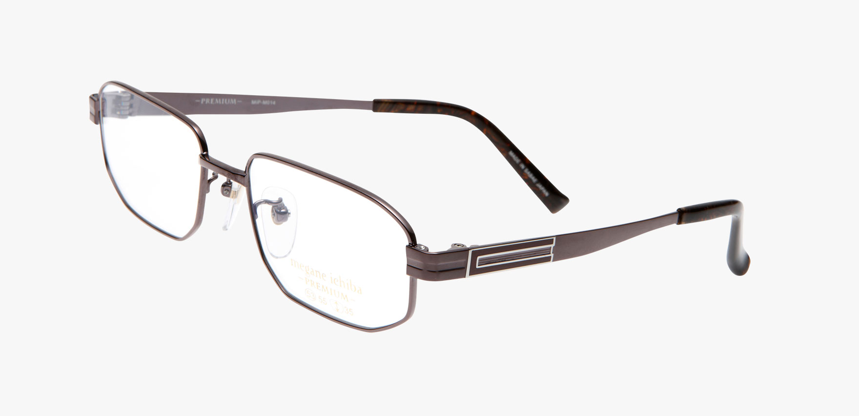 ジャパンクオリティーにこだわり、細部に至るまで丁寧に作り込まれた眼鏡市場だけのオリジナルプレミアフレーム、その名も『megane ichiba PREMIUM Men's』。MIP-M014は、テンプルの七宝を研ぎだしたパーツが特徴的です。ホールド力の高い作りで、安定感を好まれる方におすすめです。テンプルは薄く作られており、見た目のボリュームに反した軽さも長くお使いいただけるポイントです。職人の生み出す、細部にこだわって作り上げられた美しさが大人の品格を醸し出します。