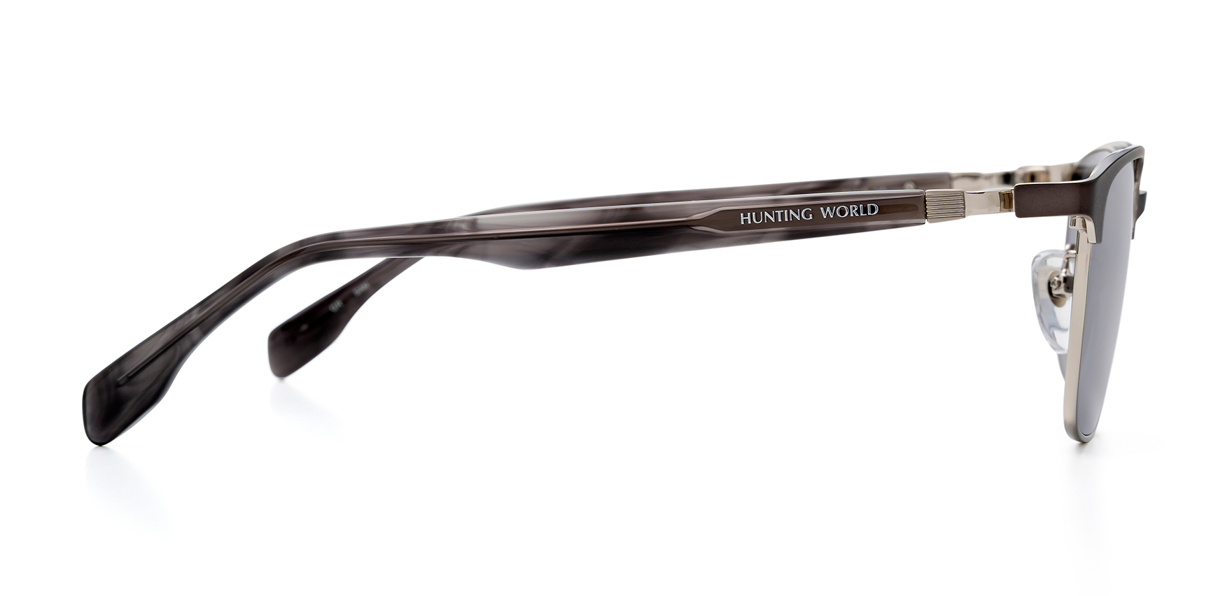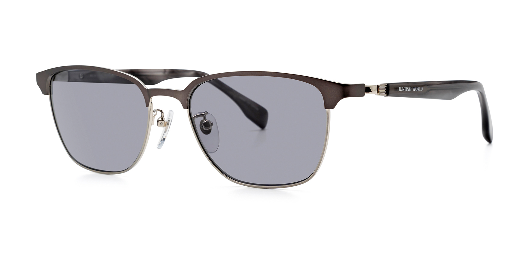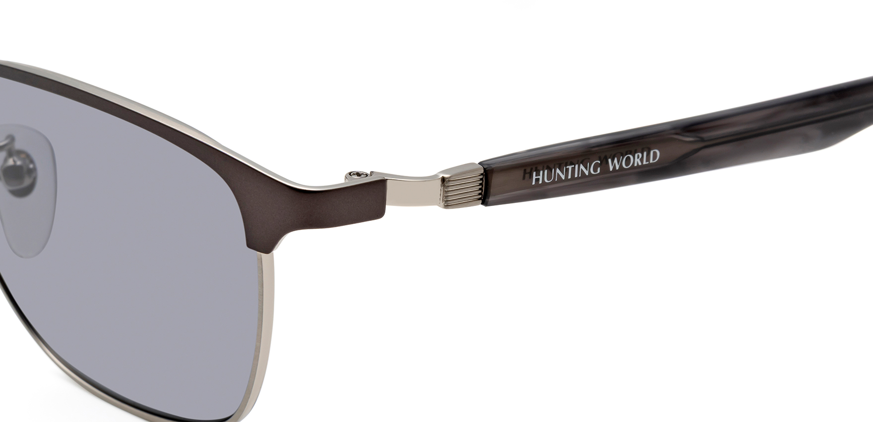 「自然との共生」をブランドポリシーとするHUNTING WORLD(ハンティングワールド)は、1965年に冒険家ロバート・M・リーによってニューヨークで設立された、幅広い世代の支持を集めるライフスタイル・ブランドです。そんなHUNTING WORLDから、メンズ用偏光サングラスが登場。眼鏡市場でしか買えない、オリジナルの限定モデルです。HTW-1017Pは、正統派なウェリントンシェイプのブローモデル。ブロー部分のシートメタルに丸みを持たせることで、上品な印象を演出します。ダーク系の偏光レンズとメタルリムのコントラストが映える一本です。