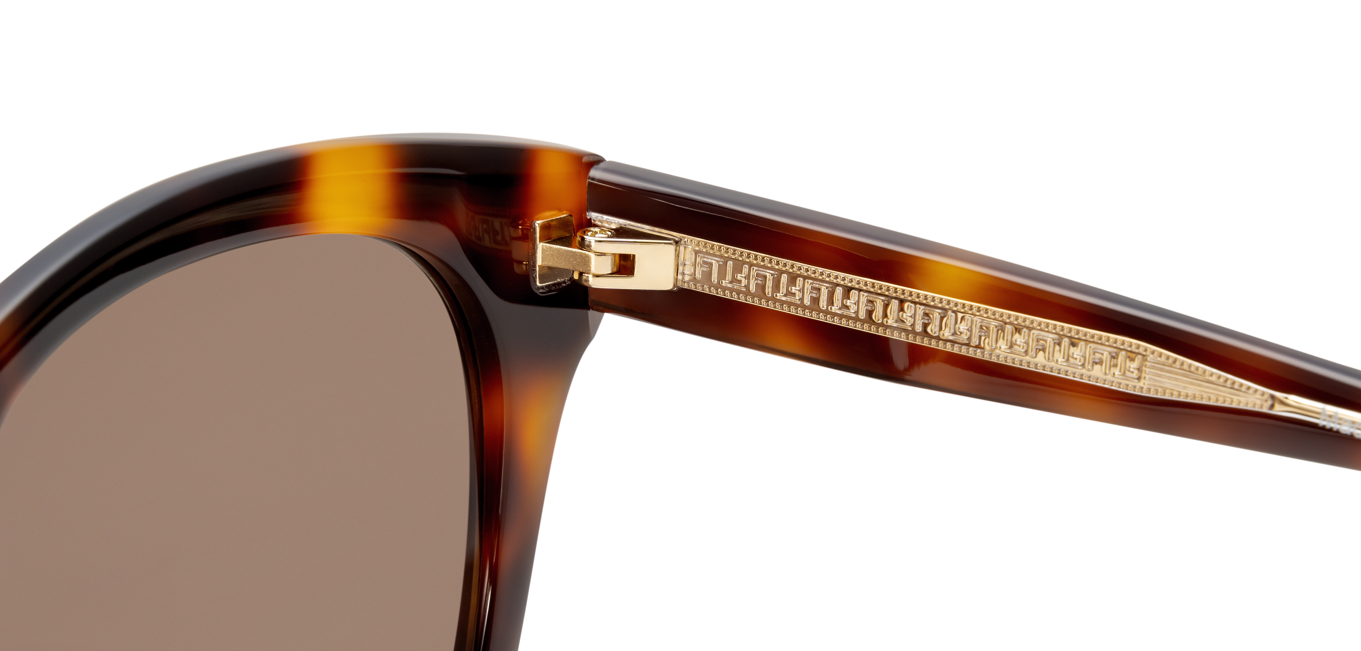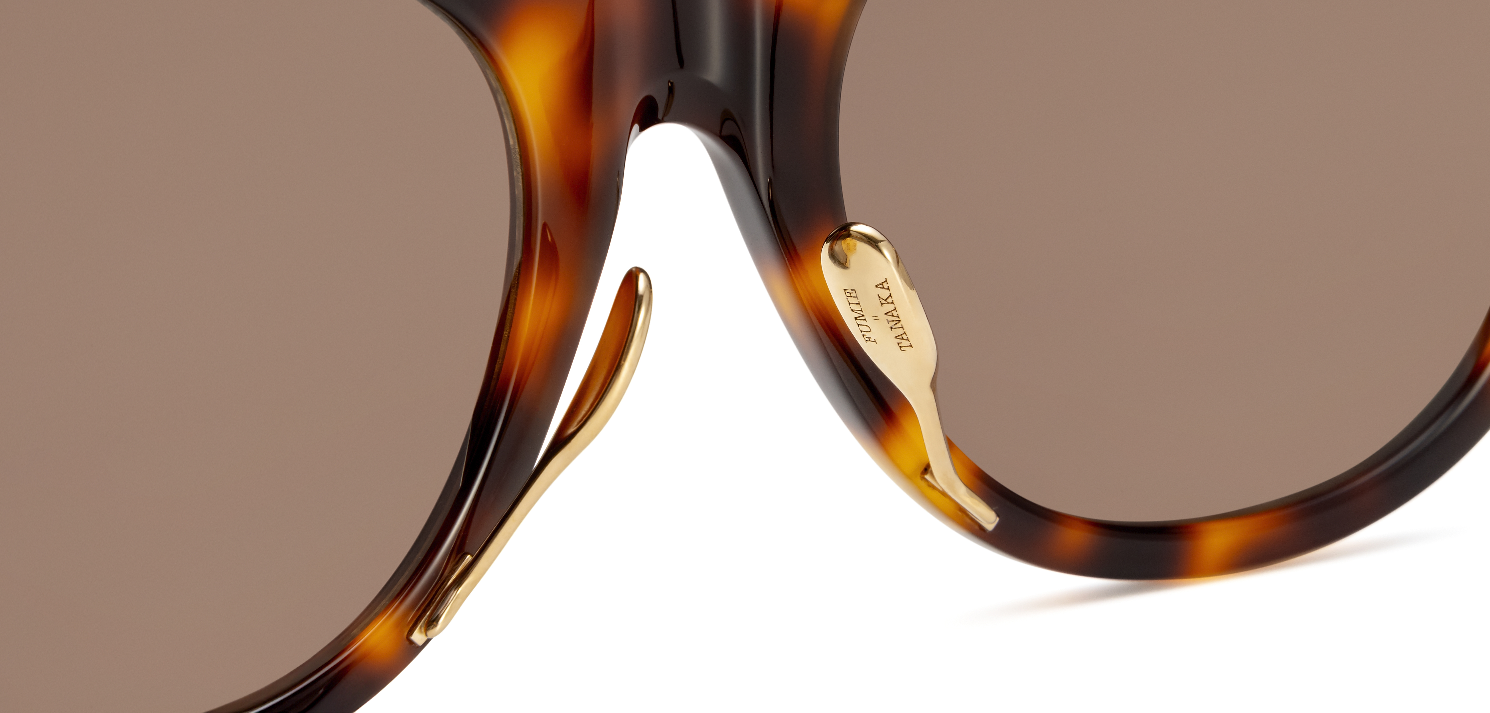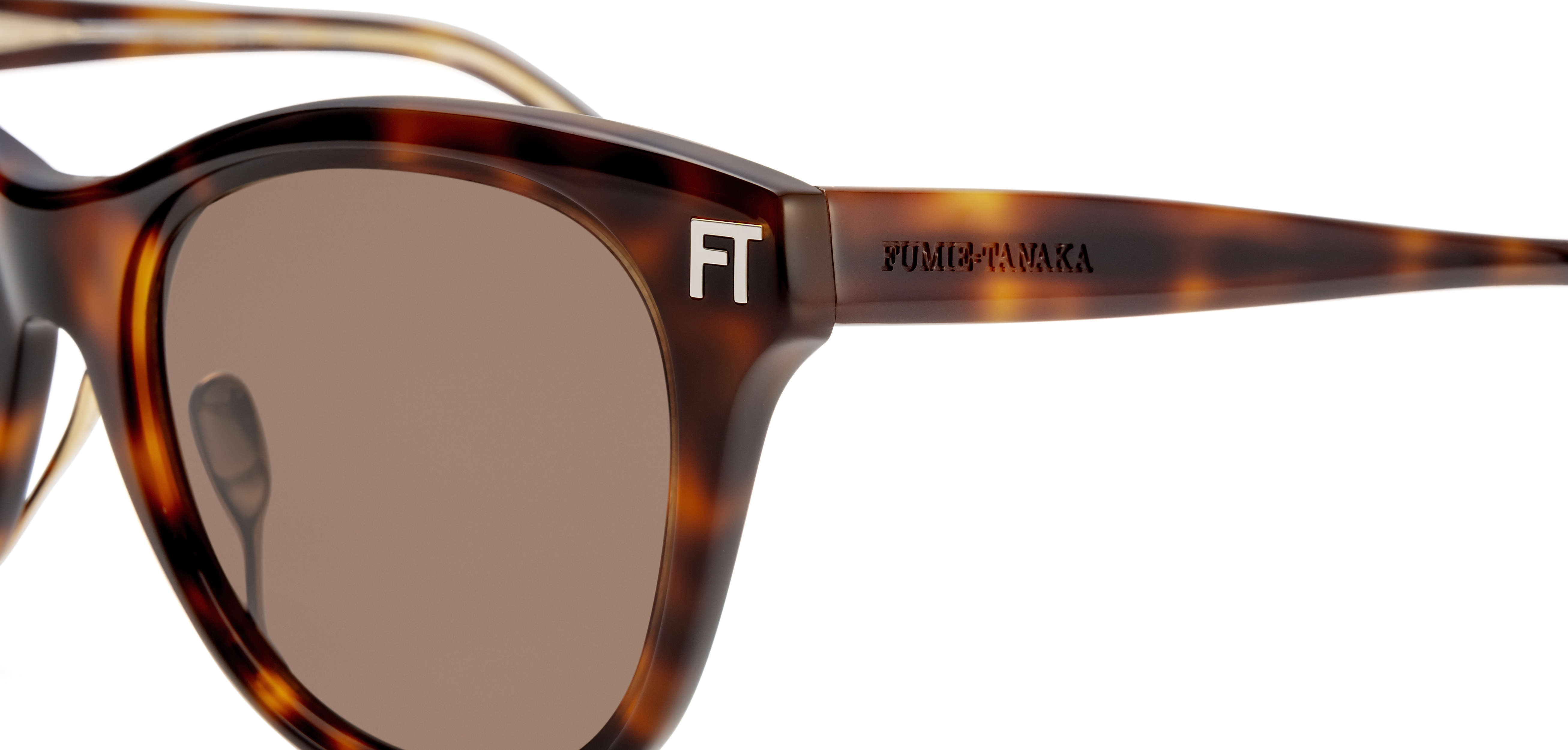 FTK-01はウェリントン型のサングラスで、1960年代に活躍したイギリス人映画女優をイメージした大ぶりなサイズに仕上げました。FTパターンをあしらったフロント飾りやテンプル芯は、ビンテージフレームからインスピレーションを得てデザインされています。テンプルの内側や鼻パッドなど、着用している人自身にしか見えない部分に彫刻を施し、特別感のある一本となっています。