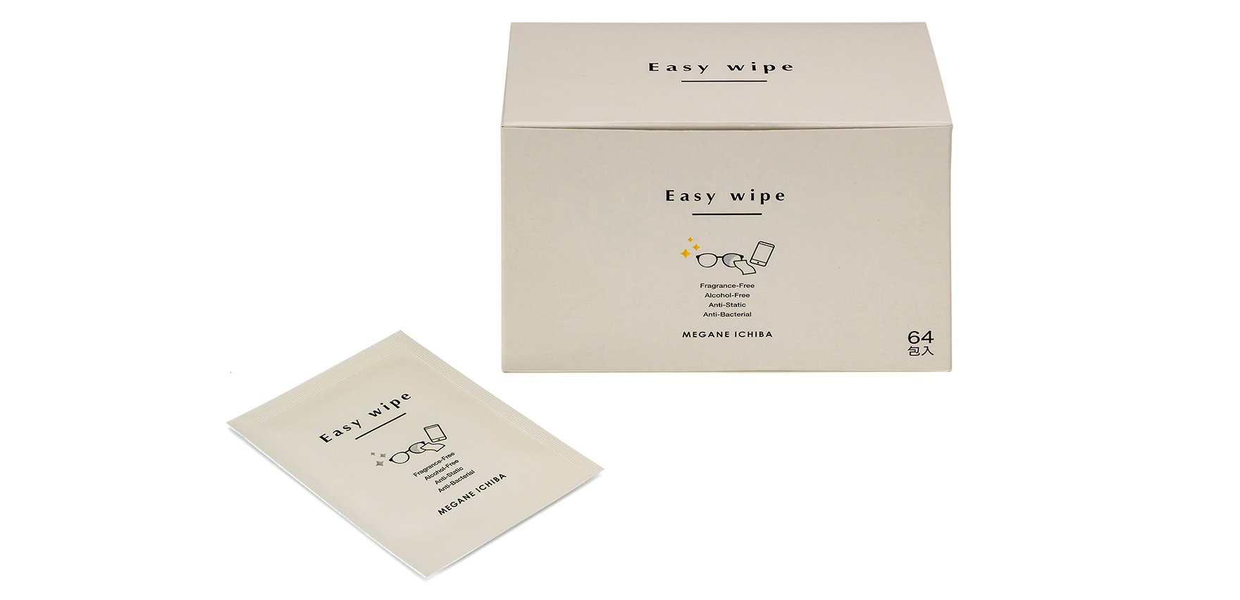 Easy Wipeは、拭くだけでレンズの指紋・脂汚れをスッキリきれいに落とせ、除菌・抗菌・帯電防止効果で清潔な状態を保ちます。無香料・ノンアルコールなので、いろいろなものに安心してご使用できます。速乾性のウェットティッシュタイプかつ1枚ずつの個包装なので、清潔で持ち運びにも便利です。眼鏡以外にもモニターやカメラ、ゲーム機器などにもお使いいただけます。
