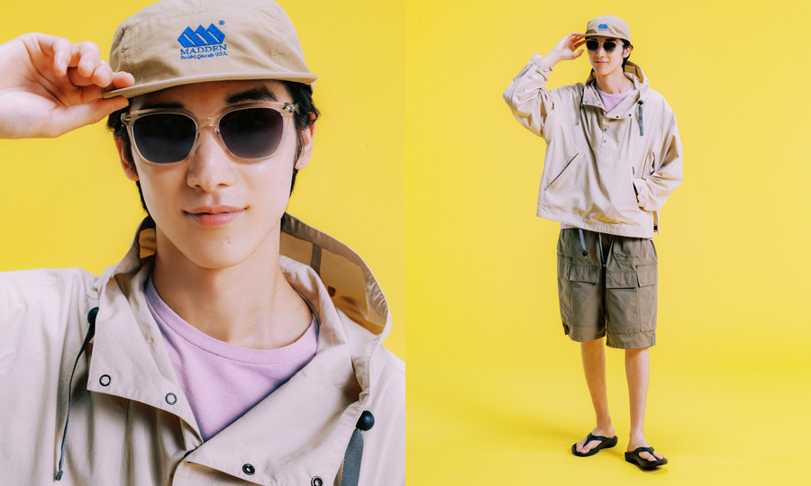 アノラックパーカ¥31,900・ショーツ¥24,200(ともにジュゲム)・Tシャツ¥6,930・キャップ¥7,480・サンダル¥5,500(すべてメデン)/HEMT PR