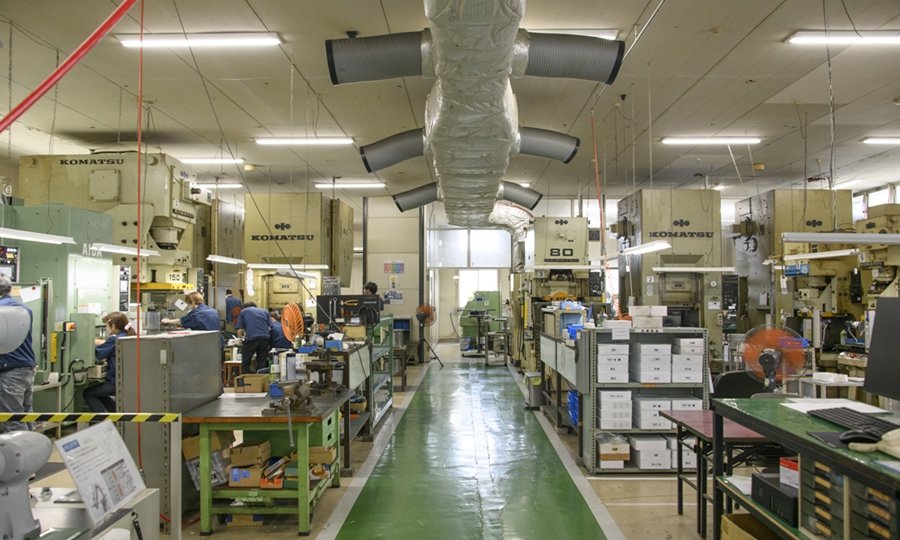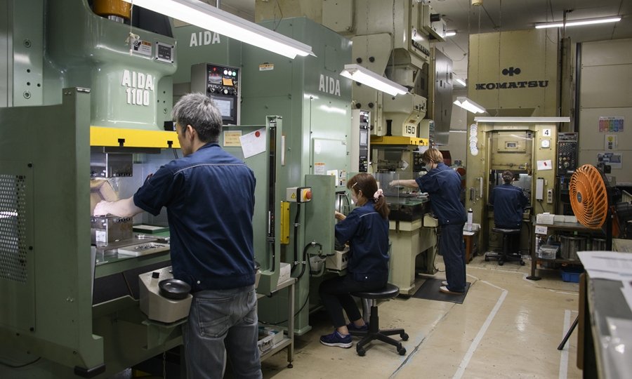 チタンを成形するプレス機が並ぶエリア。たったひとつのパーツを成形するために何台もの機械と人手を要する。