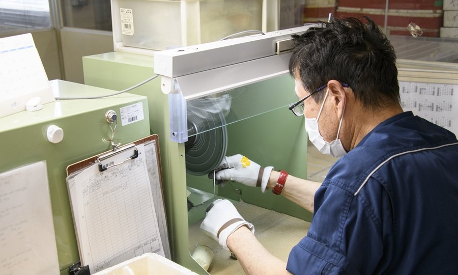 工場スタッフは140人。40年以上メガネ作りに携わる職人も多数在籍している。写真の男性は最高齢となる73歳の凄腕の磨き職人だ。