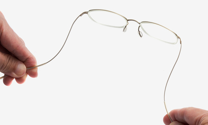 最大の特徴は、メガネにおいて最も負荷がかかる“蝶番(ヒンジ)”をなくした引き算の設計。大胆なヒンジレス構造を支えるのは、重さをほとんど感じない直径1mmの極細チタンだ。
