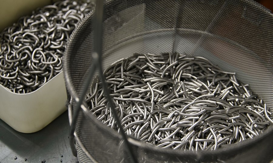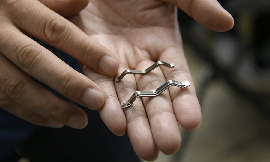 メガネ部品として加工するためにカットされたチタン。これにプレス機で圧力をかけて部品を成形していく。