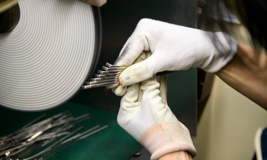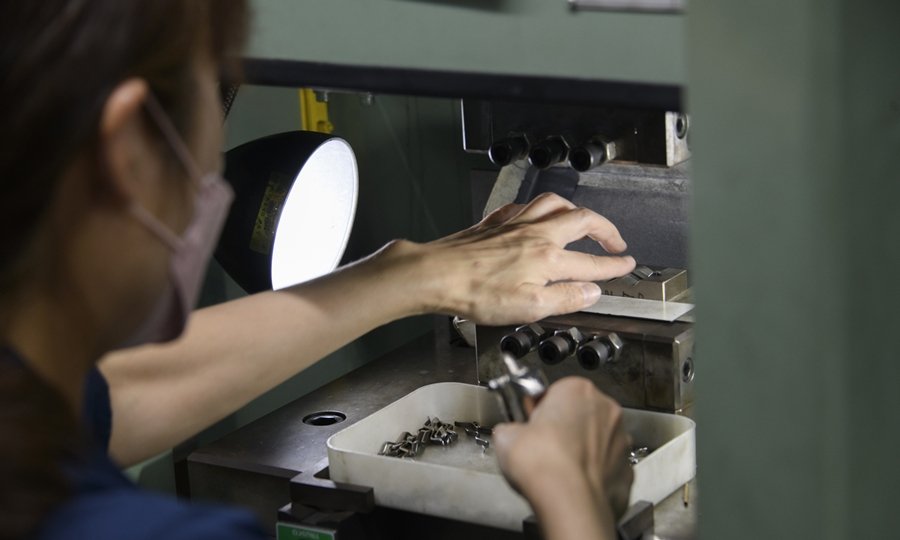 プレス成形した部品を磨き上げる“バフがけ”の工程は、熟練度を要する繊細な作業。