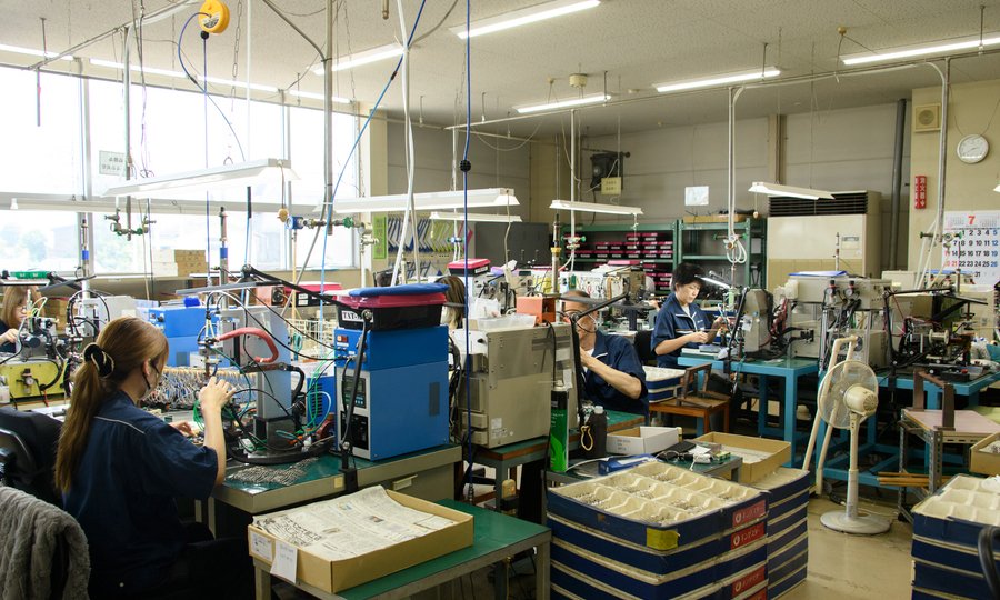 主に部品の組み立てを行うエリア。極小のパーツも多いため、指先が器用な女性の職人も多数活躍している。