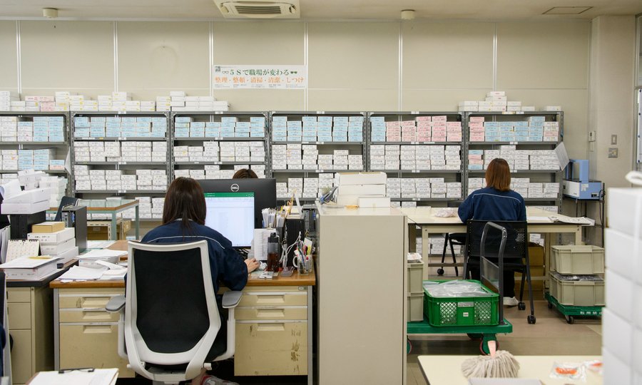 眼鏡市場のオリジナル商品を製造するキングスター工場は、鯖江でも有数の規模の大きなメガネ製造工場。メガネ作りにおける200〜250の工程がエリアごとに振り分けられている。