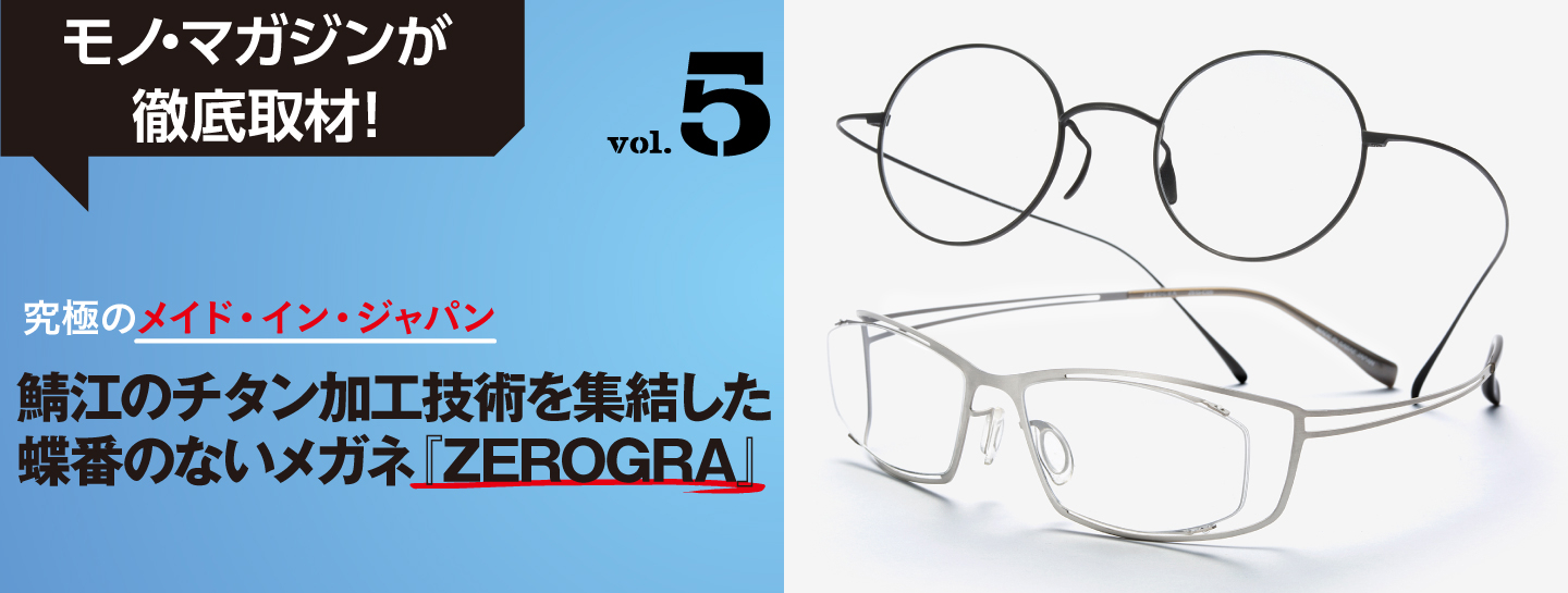 2011年に誕生した『ZEROGRA』は、そんな日本製メガネの究極を目指した、実に贅沢なブランドといえる。コンセプトは世界一の軽さと壊れにくさ。その答えとして、メガネの中で最も負担がかかって壊れやすい“蝶番(ヒンジ)とネジ”を取り払ってしまうという大胆なアイデアが採用された。